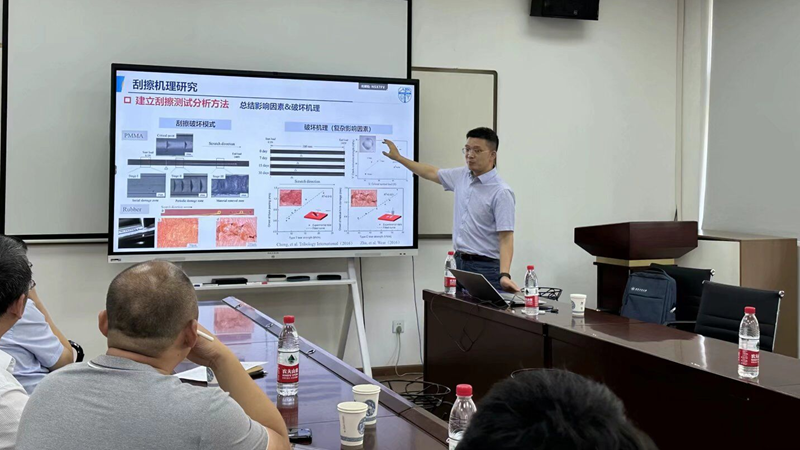 在报告中,蒋晗教授指出刮擦造成的表面划痕会导致柔性膜/涂层系统的结构完整性、功能稳定性和美观性的严重劣化,因此工程应用和科学研究需要柔性膜/涂层刮擦破坏的测试方法和机理分析。同时,蒋晗教授总结了团队在柔性膜/涂层刮擦测试方法和机理分析方面的研究进展,最后给出了膜/涂层刮擦的测量指标和测试方法,揭示了刮擦变形破坏机理,为制定柔性膜/涂层表面刮擦测试的行业标准提供支撑。报告吸引了众多青年教师及本科生、研究生同学参加。