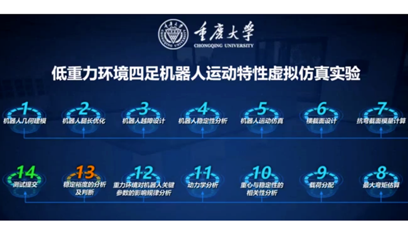 万玲教授任负责人,杨昌棋教授、张元勋副教授、张晓敏教授、张亮教授等主要成员参与设计开发的“低重力环境四足机器人运动特性虚拟仿真实验”获批国家虚拟仿真实验教学一流课程。该虚拟仿真实验教学借助现代信息技术、人工智能技术与实验教学的深度融合,有效解决实际实验教学项目中存在的“不能做”、“不敢做”、“不好做”等问题,是学院大力推进高等教育信息化的重要内容和实验教学的重要组成部分。