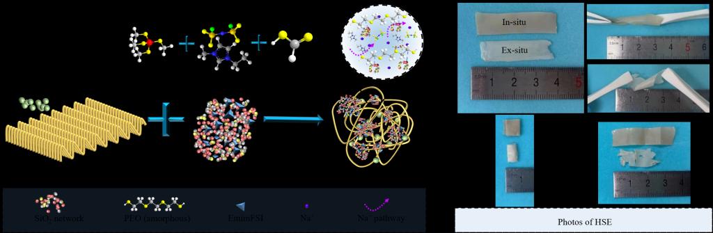 钠资源储量丰富、成本低、氧化还原电位低,钠离子电池的研究始终备受关注。与锂离子电池相似,采用液体电解质的钠离子电池也存在枝晶生长、电解液易燃等安全性问题,因此,钠离子固态电解质取代液体电解质成为制造高安全、高能量密度钠金属电池的一个有吸引力的解决方案。基于此,研究团队提出了一种原位杂化策略,通过经典的非水解溶胶-凝胶法,将离子液体固化在纳米二氧化硅骨架内(EmimFSI@SiO2 ionogel),然后与聚合物PEO和无机Na3Zr2Si2PO12原位复合,形成了自支撑的钠离子杂化固态电解质,室温离子电导率高达1.5×10-3 S/cm、电化学窗口达5.4 V vs. Na/Na+,解决了PEO基聚合物电解质离子电导率低、力学特性差、电化学稳定窗口窄的难题。