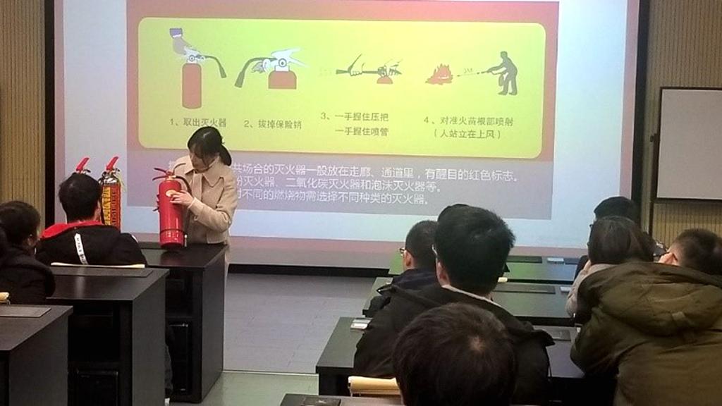 接着,保卫处的老师介绍了一些火灾的规律,并讲解了灭火的基本方法以及各种灭火工具的用法和需要注意的地方,包括灭火器、消火栓以及灭火毯的使用方法,并做了现场演示。