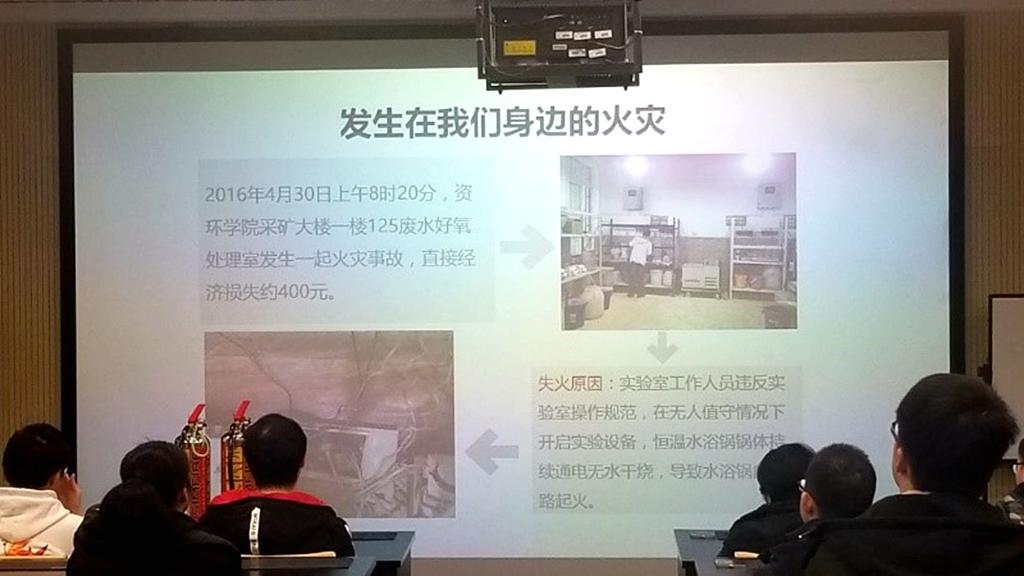 活动分为三部分,第一部分是精彩而又发人深省的案例分析;第二部分是介绍消防安全知识、逃生技巧、以及各种逃生指令;第三部分是消防逃生演练。保卫处的老师首先介绍了一些发生在我们身边的案例,比如采矿大楼发生的一起火灾事故,失火原因是实验室工作人员违反操作规范,无人值守下开启实验装备,锅炉通电无水干烧导致起火。