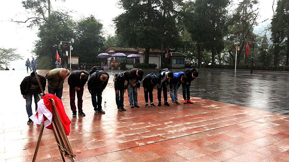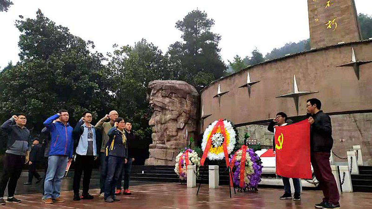 参观完会址,大家又沿着充满红色元素的红军街前往红军山烈士陵园缅怀革命先辈,并沿途参观了红军总政治部旧址。路边老人们的红歌表演更是拉近了大家与那些枪林弹雨年代的距离。经过317级大阶梯的攀爬,大家终于到达红军山烈士陵园。万玲书记带领全体党员向烈士敬献了花圈,并仔细整理挽联,随后,全体党员向烈士墓三鞠躬,致以深深的敬意。最后,万玲书记带领全体党员在烈士纪念碑前重温了入党誓词。