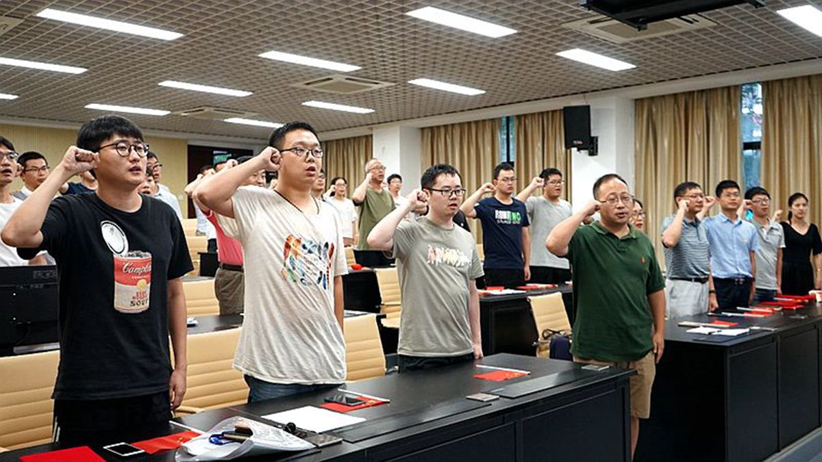 “我志愿加入中国共产党,拥护党的纲领,遵守党的章程,履行党员义务,执行党的决定,……”在鲜红的党旗下,程乐带领新党员宣誓,老党员重温入党誓词。