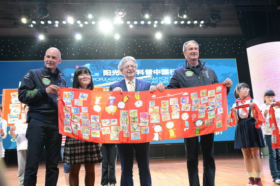最后,活动承办方向瑞士驻华大使以及两位飞行员分别赠送了由65幅重庆青少年绘制的创意绘画作品而制成的丝巾。这些绘画是重庆市科协为配合“阳光动力2号”环球飞行经停重庆活动组织的“未来新能源飞行器”创意绘画大赛的作品。下午4点,本次见面交流活动圆满结束。