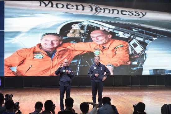 在播放了介绍“阳光动力2号”的纪录片后,两位飞行员与大家展开了交流。伯特兰•皮卡德(Bertrand Piccard)先生回顾了自己家族的探险历程,介绍了他的祖父和父亲的探险史,让他萌生了不使用化石燃料飞行的想法。经过多方努力和试验,在和搭档安德烈•波许伯格(André Borschberg)先生的共同努力下,最终成就了今天的环球飞行,他希望同学们也能用自己的青春和智慧为人类的科技进步做出贡献。安德烈•波许伯格(André Borschberg)是一位经验丰富的飞行员、多项航空记录的保持者,同时也是力学和热力学工程师。他鼓励青少年从小树立远大的理想,不断实践自己的头脑的想法和创意,并最终改变这个世界和人民的生活。两位飞行员还围绕自己飞行事业的远大意义和清洁能源的利用等问题与现场观众朋友进行了交流。在被提及“家人是否支持探险活动”、“如何面对困难和危险”等问题时,他们强调的是要注重减少危险而不是去挑战危险,也提到组建高效的专家团队并相互配合的重要性。