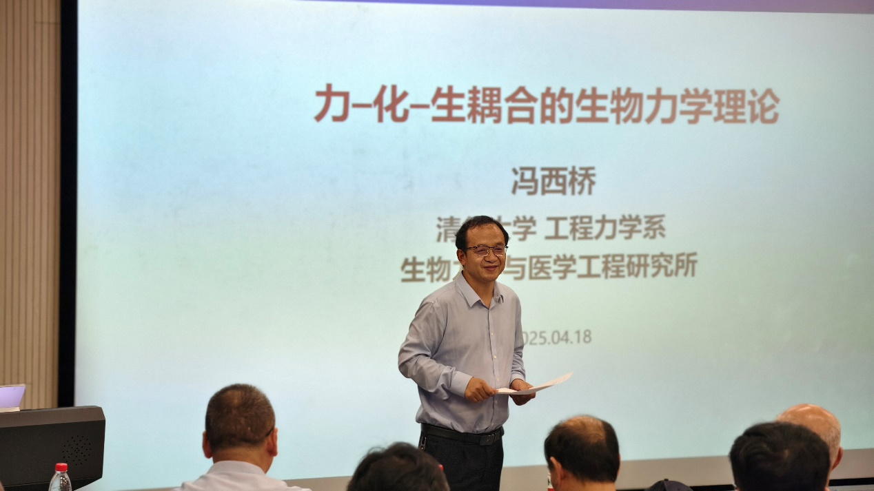 在报告中,冯西桥教授指出癌症及心脑血管、神经、免疫系统等重大疾病的发生发展,与生物学、化学、力学等因素的相互作用和协同演化密切相关。建立相应的生物力学理论与模型,对疾病的溯源、趋势研判及诊疗康复意义重大。随后,他围绕力-化-生耦合理论的基本思想,详细阐述了肿瘤的力-化-生耦合生长理论、免疫系统的力-化-生耦合理论等核心内容,并分享了团队将该理论应用于肿瘤、淋巴、神经系统等生理和病理过程研究的进展。通过深入浅出的讲解,结合详实的研究数据与案例,为在场师生打开了生物力学研究的全新视角。