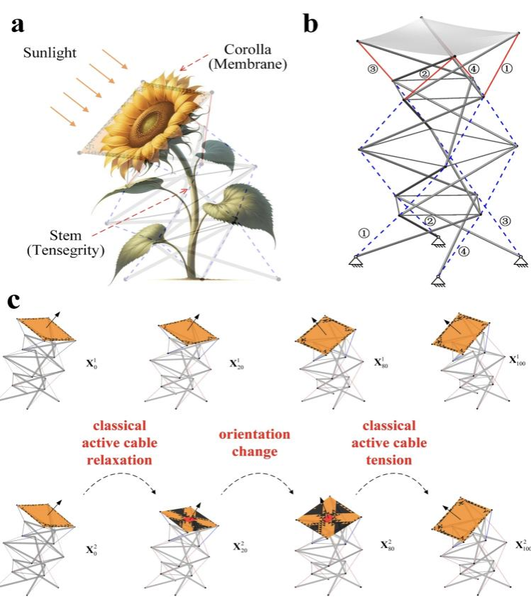 贺子刚的论文围绕“张拉整体-膜结构”开展了相关研究。该结构因其灵活的姿态控制和轻质特性在航天工程领域有着巨大的应用潜力。论文受向日葵追日灵感启发,研究并介绍了一种张拉整体-膜结构变形起皱调控的高效计算方法。他结合机器学习方法,实现了张拉整体-膜结构姿态调控与膜面褶皱抑制的能量最优控制。与传统的线性驱动相比,新的驱动方式在能量消耗和膜面褶皱面积方面均显著降低,可为未来新型空间太阳能电站结构设计提供理论参考。
