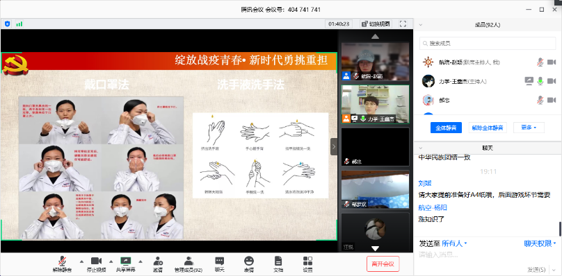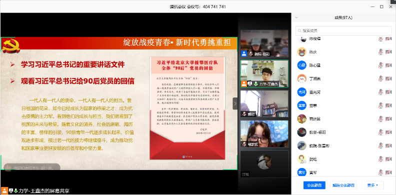 于2020年5月31日18:00-20:00在腾讯会议APP上举办了以“绽放战疫青春•新时代勇挑重担”为主题的研究生党团活动。
