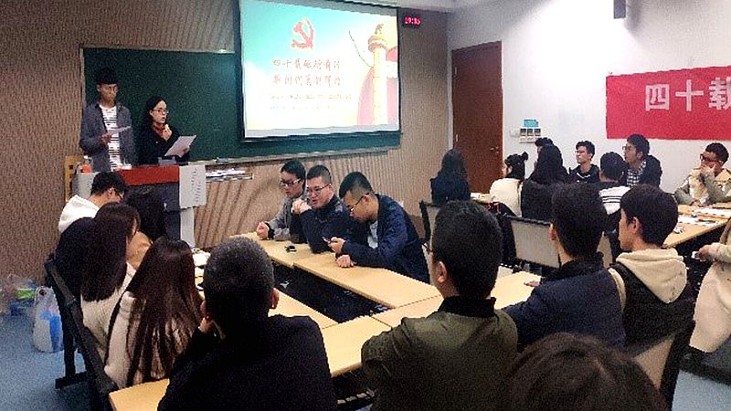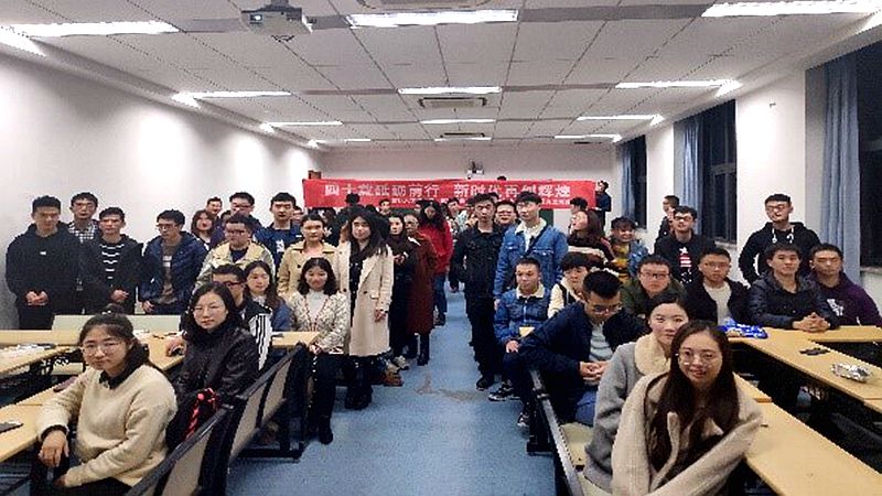 20181110日,在A8513教室,百合小说 、法学院、动力工程学院三学院联合举办了四十年砥砺前行,新时代再创辉煌主题党团活动。活动开始,主持人激情洋溢的开场致辞立刻带动了在场各位同学们的热情。