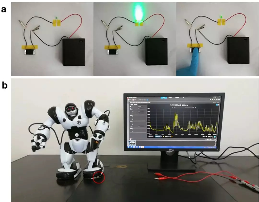 图6.(a)传感器开关,在压力作用下,传感器电阻增加,使灯泡亮度明显变暗。(b)柔性传感器可以安装在机器人脚底以监控机器人跳舞。
