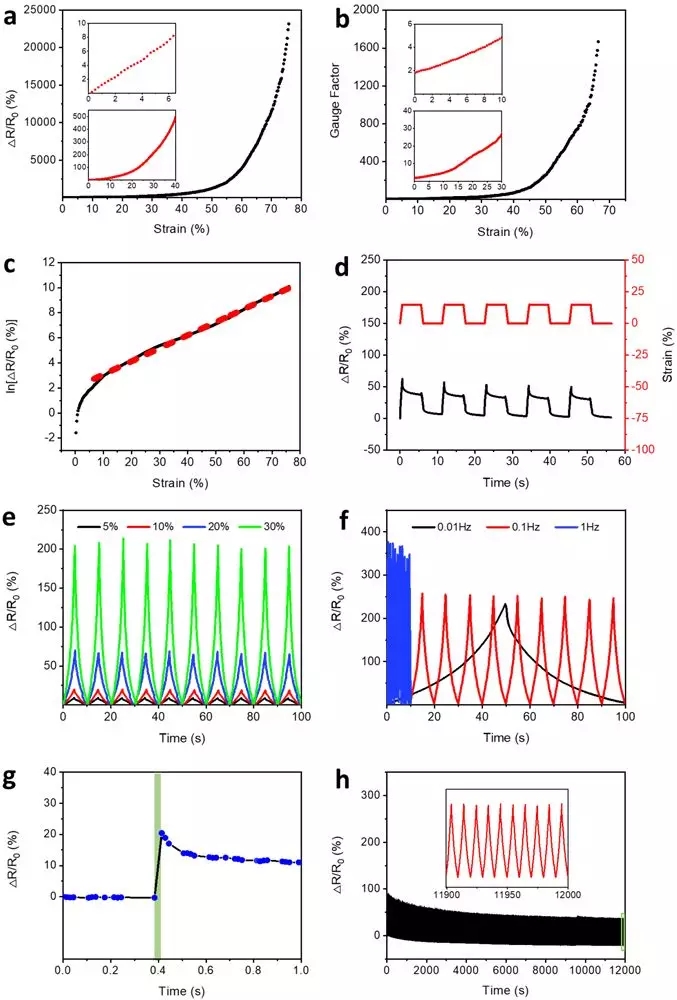 图3.(a)rGOFF / PDMS传感器的电阻在不同压缩应变下的相对变化。(b)不同压缩应变下传感器的灵敏度系数。(c)对a取自然对数证明电阻的相对变化在大应变下的指数变化规律。(d)0.0%-15.0%应变下加载—卸载试验中电阻和应变随时间的相对变化。(e)在不同压缩应变下的电阻相对变化。(f)在30.0%压缩应变下,不同频率时电阻相对变化。(g)响应时间和(h)20.0%压缩应变下的循环稳定性试验。