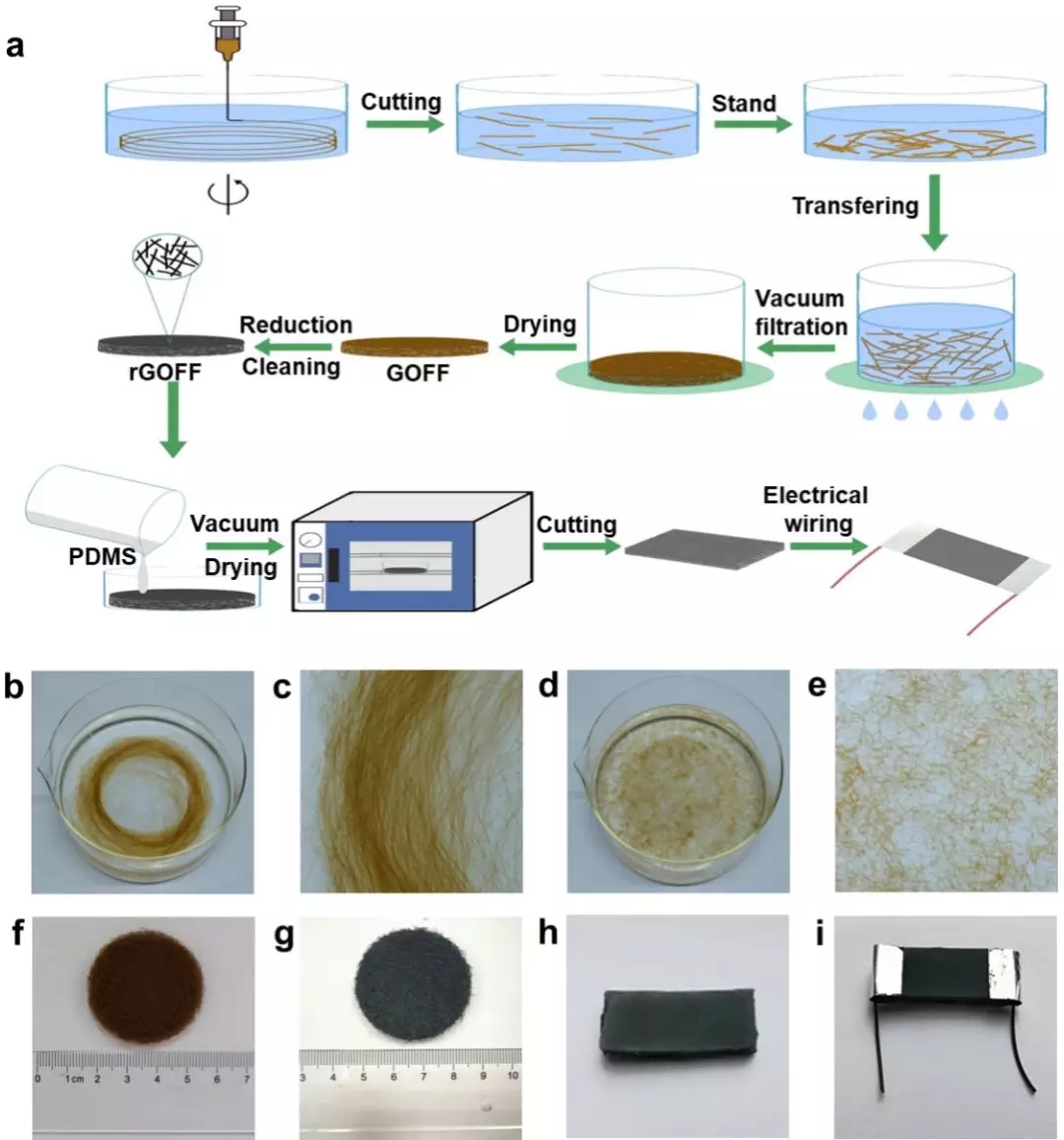 图1.(a)制备rGOFF / PDMS传感器的简化过程。(b,c)长GO纤维,(d,e)短GO纤维,(f)GOFF,(g)rGOFF,(h)rGOFF / PDMS复合材料,(i)rGOFF / PDMS传感器的光学照片。