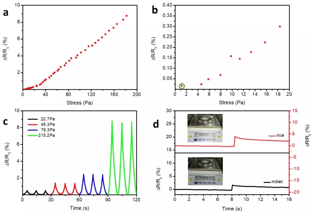 图4. rGOFF / PDMS传感器在小应力下的响应。(a)rGOFF / PDMS传感器的电阻针对压缩小应力(0.0Pa-200.0Pa)的相对变化。(b)0-20.0Pa小应力下电阻的相对变化,突出检测超小应力的能力。(c)四种不同小应力下电阻的相对变化。(d)放置大米和小米时传感器电阻的相对变化。