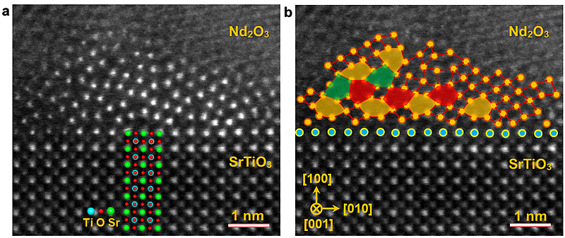 尹德强副教授研究团队采用扫描透射电子显微术与第一性原理理论计算相结合的方法,在采用不同沉积方法制备的陶瓷材料MgO和Nd2O3薄膜材料中发现了一维有序晶体,更新了人们对固态物质结构的认识。研究发现,该结构仅在一个方向上保留了晶体的平移对称性和周期性,在其他方向上其原子呈现无序排列,形成了具有一维平移周期性的长程有序结构,构成一维有序晶体的结构单元的原子排列与重位点阵倾转晶界的结构单元非常类似。研究表明,尽管MgO晶体是能隙为7.4 eV的绝缘体,MgO一维有序晶体则是能隙为3.2 eV的宽带半导体。一维有序晶体的发现表明固态物质结构的种类比人们的已有认知更加丰富,并且新结构的物理性质与相应常见结构类型具有显著差异。