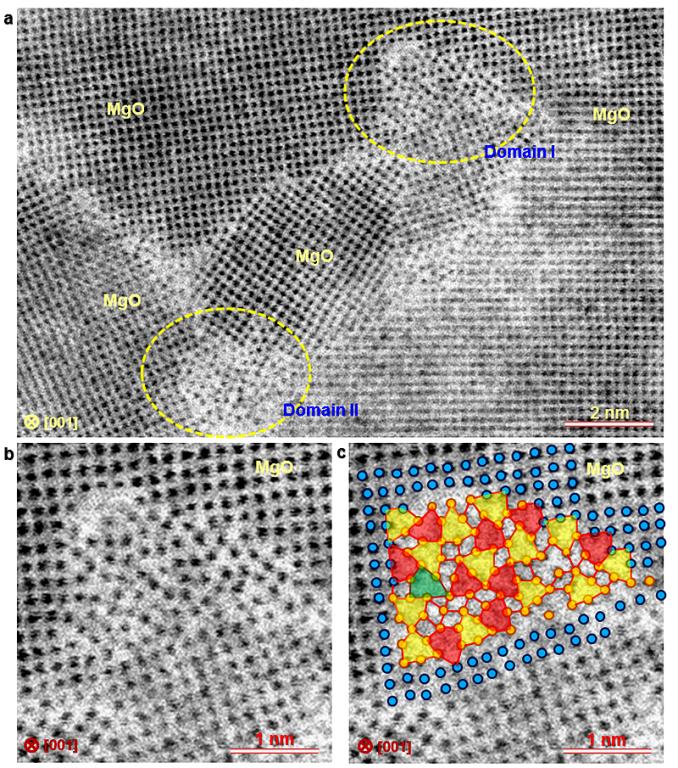 图2、形成于三叉晶界区域的MgO一维有序晶体的ABF STEM像(见区域I和II)。MgO一维有序晶体由许多六边形结构单元构成(彩色阴影所示),其原子排列与MgO Σ5 (210)[001]晶界结构单元类似。