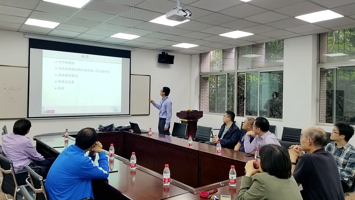随后孙丰伟博士以《多尺度模拟马氏体钢变形》为题作了学术报告。据介绍,马氏体钢P91以其良好的耐高温、耐腐蚀等特性广泛应用于传统火力发电站的蒸汽管道等耐热设备部件。研究马氏体内部结构与原奥氏体的关系对于理解其塑性变形机理以及断裂尤为重要,且能为预测材料力学性质提供重要依据。孙博士团队通过电子背散射衍射、扫描电子显微镜确定了晶体方向以及晶界种类,并发现P91马氏体与原奥氏体在晶向上符合Kurdjumow-Sachs (K-S)关系。在有限元分析中,孙博士团队构建了将实测晶向数据包含到表征单元中来描述材料微观结构的EBSD模型,还发展了Voronoi tessellation方法并结合K-S关系,构建了研究马氏体分级结构的VT模型。该模型通过采用非线性晶体塑性模型模拟了材料单向拉伸的力学行为,还可以系统研究马氏体晶粒间相互作用以及晶粒的尺寸效应。在提问环节,孙丰伟博士就其理论成果的应用前景等问题和各位老师作了详细交流,现场气氛热烈。