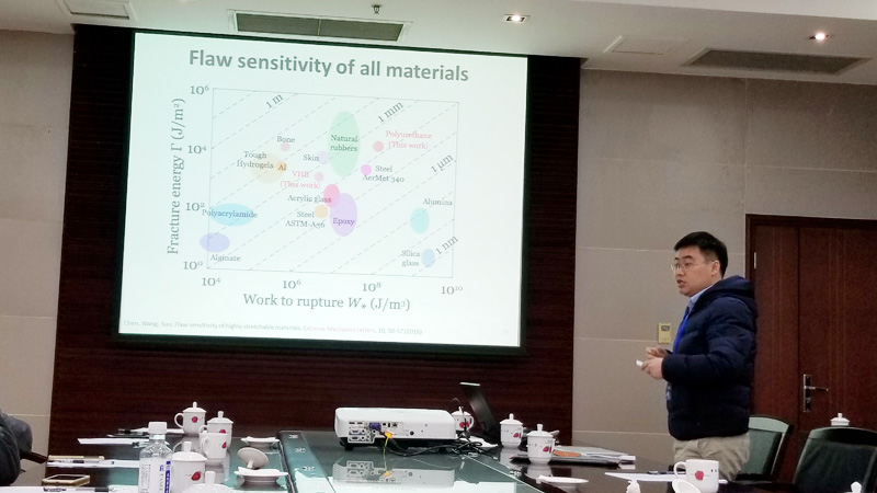 正在哈佛大学从事博士后研究工作的王正锦博士报告题目是《Mechanics of soft materials and application in oilfields》, 他介绍了软材料断裂中的两个基本问题:材料的缺陷敏感性和高韧性水凝胶中裂纹扩展阻力曲线的尺寸效应,并通过理论推导和实验测试给出了两个对应的特征长度。王正锦博士还详细介绍了凝胶在油气井密封中的应用。他通过低压、透明的桌面尺寸实验装置模拟了石油封隔器的不同失效模式,并通过理论推导给出了封隔器的临界泄漏压力的解析解,对于封隔器的设计和改良提供了重要的指导准则。