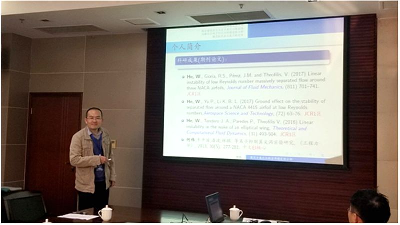 论坛最后一场报告来自香港城市科技大学的何伟博士。他在报告《层流分离流动的全局稳定性分析》中,通过直接数值模拟方法与小扰动线性化理论求解了小雷诺数大攻角下翼型失速分离流动下的一次与二次不稳定分析结果,纠正了前人给出的扰动的主导模态是stationary 类型,证明了Kelvin-Helmholtz模态是扰动的主导项,并利用二次失稳理论重新解释了三维机翼失速分离流动中的stall cells流动拓扑结构的生成机理。研究成果可以为设计主动流动控制系统的提供优化参数。