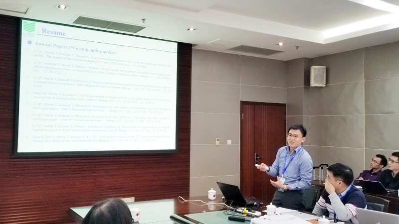 在第二场题为《Study on aerodynamic forces and flow field of wind turbine with wind tunnel and field experiments》的报告中,日本国立三重大学研究员李庆安博士主要利用风洞试验和外场测试技术考察了直线翼垂直轴风力机的空气动力学和流场特性。他在风洞中采用大型六分量天平探讨了风机在运转过程中在x、y、z三个方向上整机的力学特征;利用压力分布技术测量单个叶片在工作中的压力分布状况,在外场中对比分析了风洞试验和外场测试中风机力学和尾流特征,并着重考察了叶片数量、安装角度、翼展高度等风机基本参数对风机性能的影响。其研究成果实现了垂直轴风力发电机的简易设计标准。