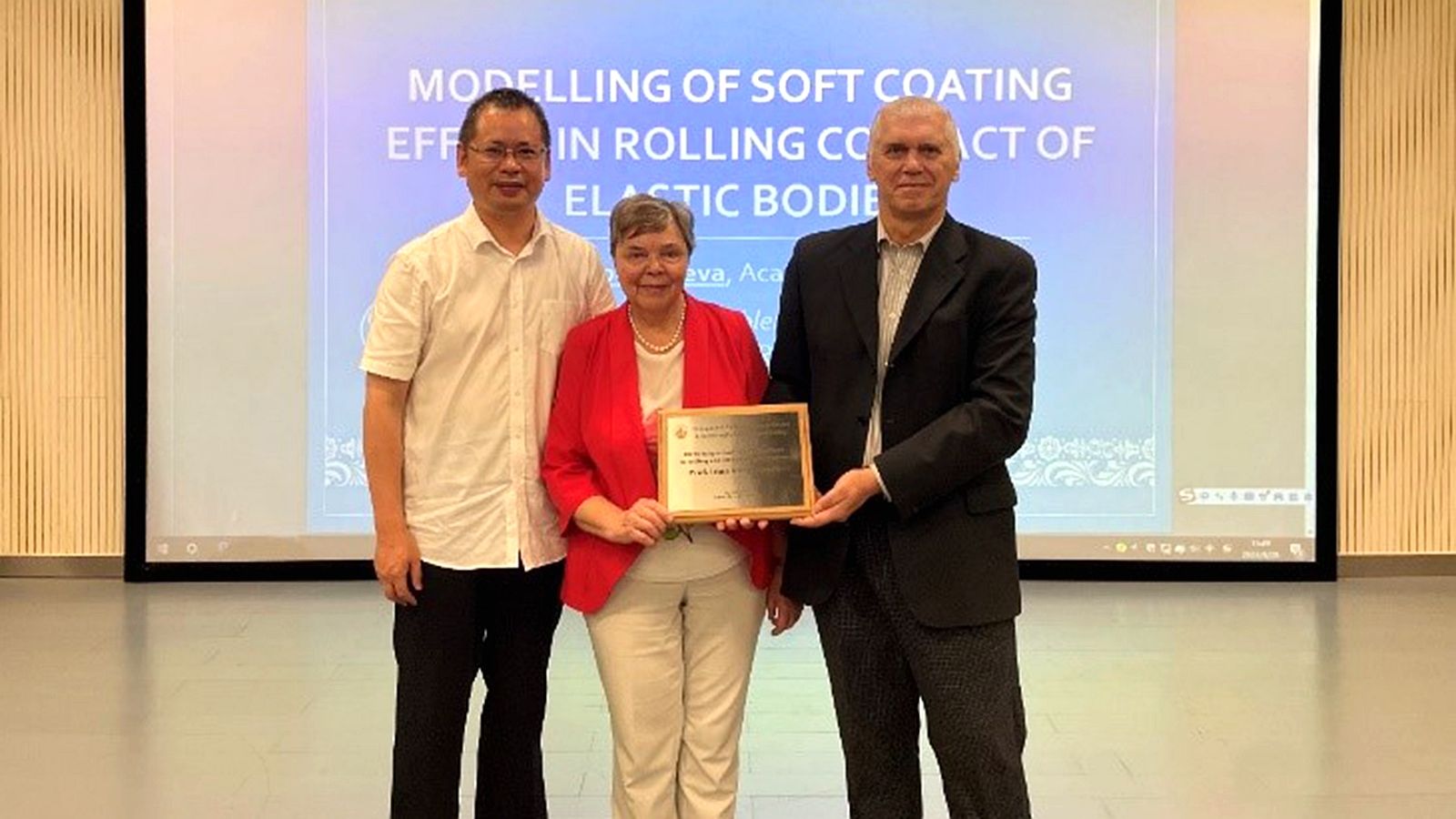 在报告中,Irina Goryacheva院士介绍了解决轴对称压头在覆盖有薄且可变形的涂层的弹性体上滚动和滑动接触问题的方法。采用了弹性模型和粘弹性模型来描述涂层的机械行为。通过对不同涂层的机械和几何特性进行接触和内部应力的计算,可以分析涂层对滚动和滑动接触中摩擦力的影响,以及其对疲劳裂纹形成的影响。