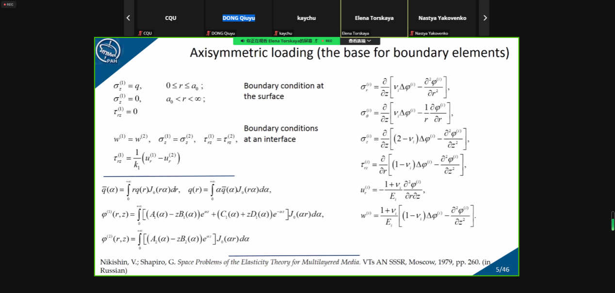Elena V. Torskaya的报告介绍了弹性和粘弹性涂层在循环摩擦载荷下的接触疲劳问题。她研究了压头和涂层体在周期性加载条件下的接触情况,分析了损伤累积率与层的粘附程度之间的关系。此外,她解决了压头周期系统摩擦接触中涂层和基底中的应力分布的问题,并分析了循环载荷在涂层和基体中累积接触疲劳损伤的动力学。最后,她计算了疲劳磨损引起的涂层厚度变化。