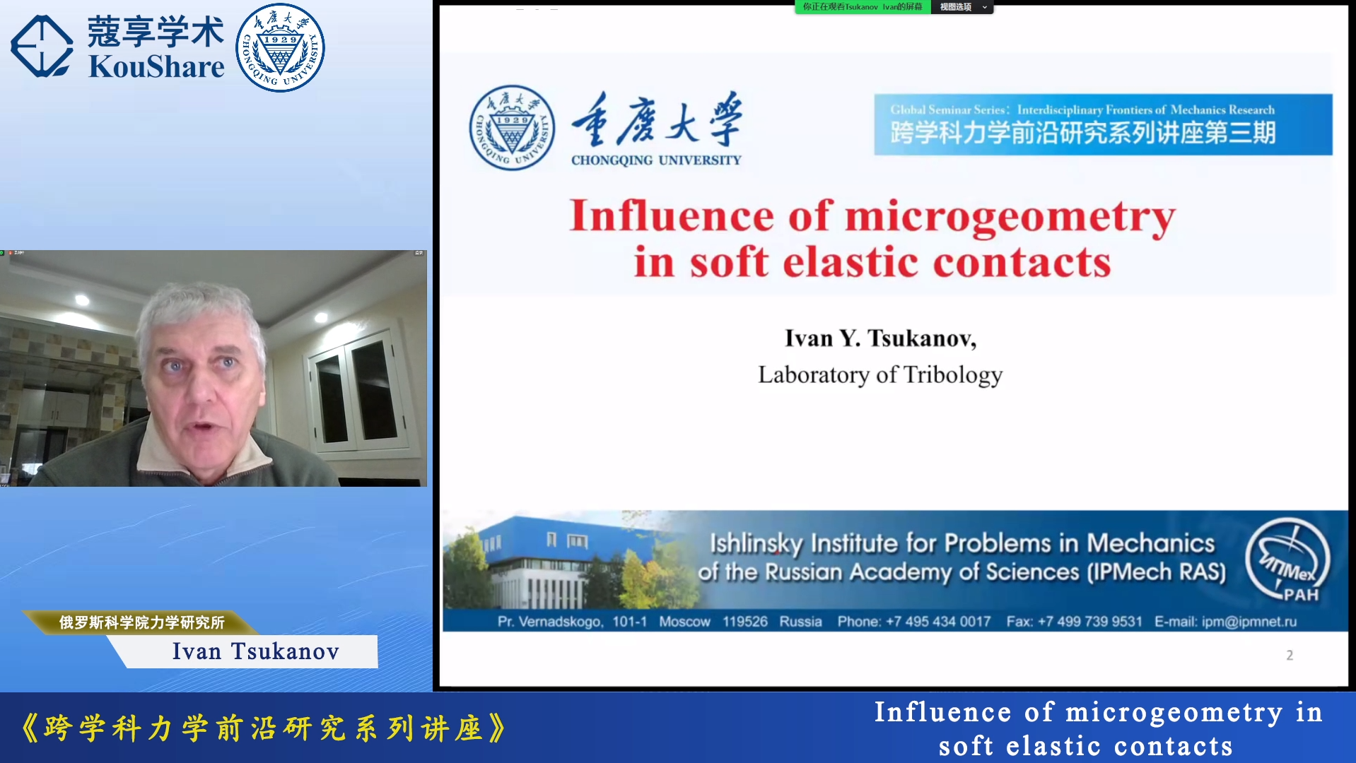 学院Feodor M. Borodich教授介绍了本次讲座的安排及嘉宾背景。Ivan Tsukanov是俄罗斯科学院力学研究所摩擦学实验室的高级研究员,也是俄罗斯摩擦学委员会的成员。博士就读于莫斯科理工大学(机械工程博士学位),并获得过俄罗斯联邦政府博士生奖学金(2012年)。研究兴趣是固体力学、接触力学、摩擦学、表面工程、制造工程。同时是30多份期刊出版物和3项发明专利的作者。