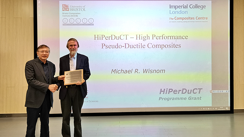 严波代表学院对Wisnom院士的访问表示热烈欢迎,并对报告人作了简要介绍。Michael R. Wisnom院士,英国皇家工程院院士,世界著名的纤维增强树脂基复合材料专家,是复合材料力学、断裂机制、失效准则与有限元分析及工程应用世界领衔权威,英国机械工程师学会和美国复合材料学会的Fellow。Wisnom教授本科毕业于伦敦帝国理工学院,博士毕业于布里斯托大学,曾在英国航空公司(British Aerospace)民用航空部门工作。1987年加入布里斯托大学作为航天器结构方向讲师,1995年成为航空航天结构教授。2006年牵头创立了英国布里斯托复合材料研究院(Bristol Composites Institute, BCI); 2007年牵头创立了劳斯莱斯全球唯一的复合材料大学技术中心(RR-UTC)并任中心主任至2017年; 联合英国龙头企业(空中客车、劳斯莱斯、维斯塔斯 等)创建了英国国家复合材料中心(NCC)并任学术委员会主席; 2009-2011年间担任复合材料国际委员会(ICCM)主席; 是复合材料顶尖期刊Composites Part A杂志主编,国际复合材料委员会World Fellow、2005年获得皇家学会沃尔夫森研究奖 (领域突出贡献奖), 迄今为止发表科研论文500余篇。