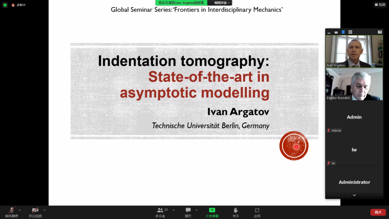 “力学交叉融合”全球前沿学科系列讲座第二期和第三期分别在线上召开。讲座分别邀请了俄罗斯科学院(RAS)外籍院士Fedor Borodich教授开展了主题为“Recent Advances in JKR Theory of Adhesive Contact”的学术讲座,以及Ivan Argatov教授开展了主题为“Indentation tomography: State-of-the-art in asymptotic modelling”的学术讲座。