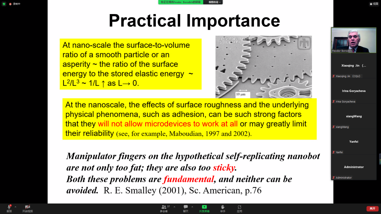 针对黏附接触问题的具体分析求解,Borodich教授介绍了JKR黏附理论所蕴含的两种思想方法,着重讲解了近年来该理论的一些相关进展。Argatov教授针对复合材料压痕技术所面临的力学分析难题,介绍了最新的理论分析进展。两位教授均与我院师生及海内外学者进行了深入探讨,细致地回答了相关学术问题。